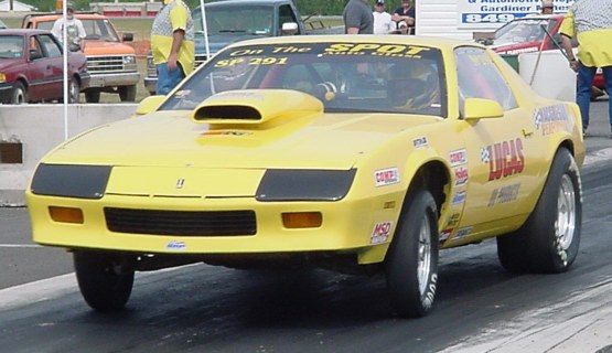 Name: Charles Coughlin - Hometown: Summerside PEI Car number and class: SP/291 Super Pro Make /Year / Model / Colour: 1985 Chevrolet Camaro / Crome Yellow - Engine Specifications: 1985 Chev 350 bored .030, solid lifter camshaft TP180 TRW, flat top Speed Pro pistons, 1970 truck heads casting # 370, Victor Junior Intake, 750 HP Holley Carburator - Chassis Specifications: Stock chassis with a ladder bar, 10 inch back wheels with 29/11 Hoosier - Best ET: 10.45 Best MPH: 128.51 Updated March 4*** - Home Track: Raceway Park / Oyster Bed Bridge PEI -Attended Super Chevy show in Epping NH Went 3 rounds with no buy backs.